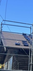 体力がいる作業ですが若いルーキーのたつ君が頑張ってくれあっという間に持っていった瓦はあがりました!そして片付けをし2日目も無事終了となりました。