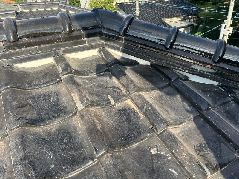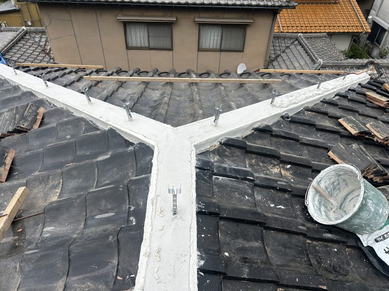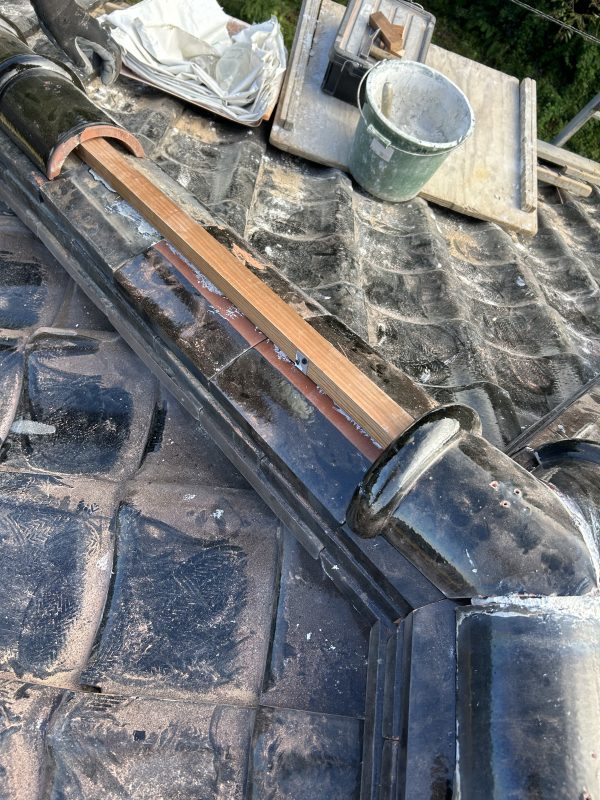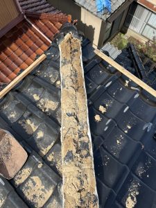 現在弊社が使用している棟土の材料は水シャットという材料を使っています。材料の中にシリコンが含有されているので固まってしまえば水を吸収することなく弾いてくれます。