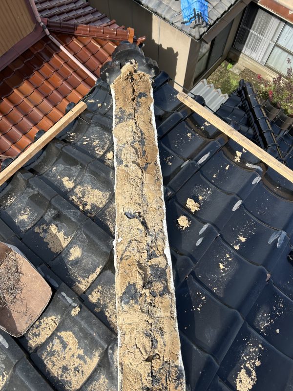 他にも他業者さんが最近施工して雨漏りした案件も何軒か工事させて頂いたりして、原因を追究して出た答えが2つ。1つはその当時使っていた土壁の質。棟土が水分、湿気を吸い続けて行き場がなくなった水分が屋根の下に流れ出る。雨が長期的に続いたりした場合に起こりやすい。