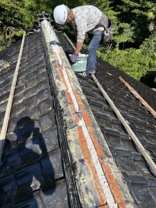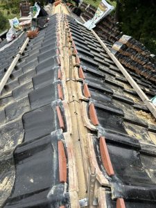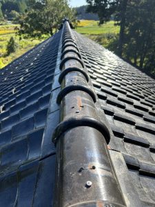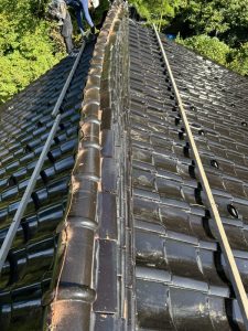 門前町の由緒ある建物だったので棟の段数もそのままの復旧工事でした。ガイドライン工法で水シャットという土壁の代わりの材料を使用した施工なので、棟が7段積んでありますが耐震性能はしっかり高く仕上がっています。