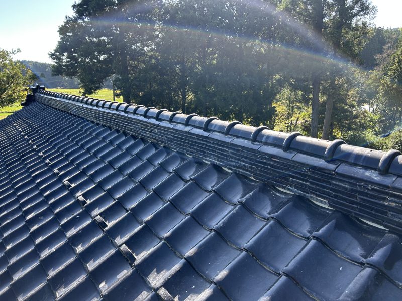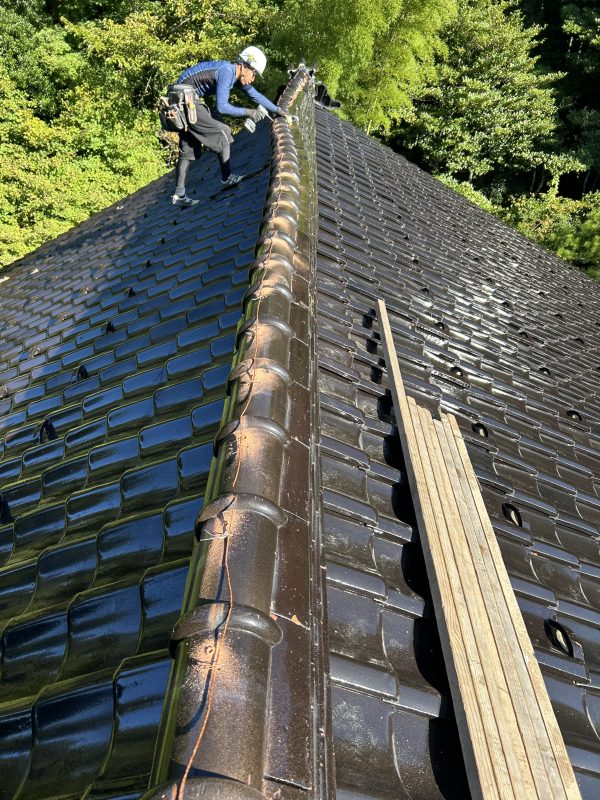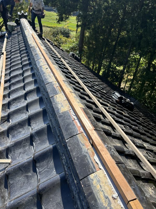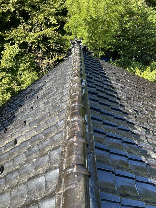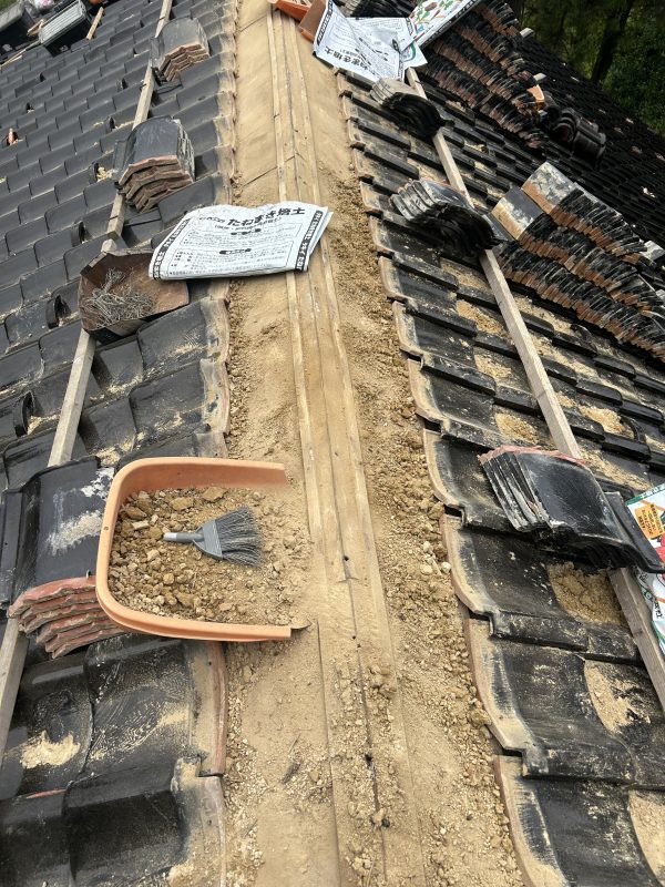 門前町の由緒ある建物だったので棟の段数もそのままの復旧工事でした。ガイドライン工法で水シャットという土壁の代わりの材料を使用した施工なので、棟が7段積んでありますが耐震性能はしっかり高く仕上がっています。